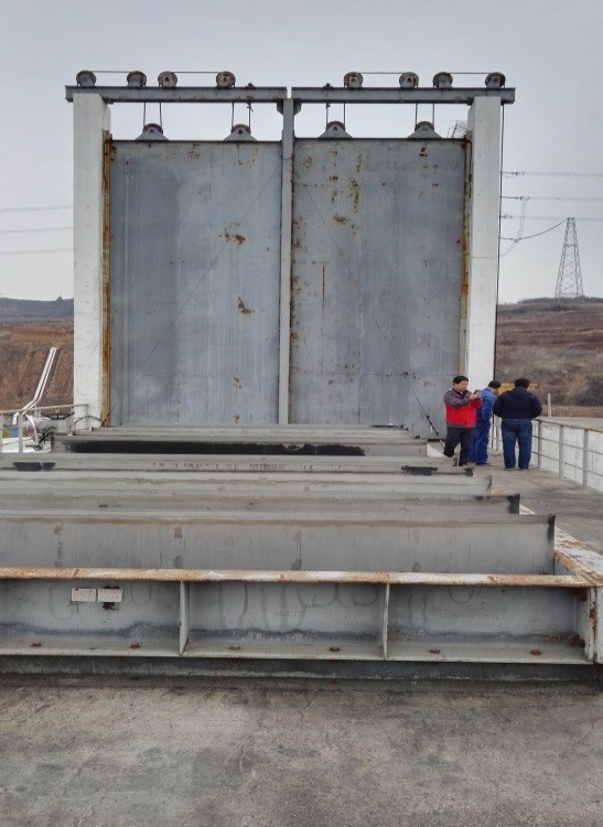 通过与工作人员的深入交流,发现转叶式风门系统存在的几个问题,一是密封问题,虽然转叶式风门的漏风量在规定的范围内,但在下雨时雨水会通过顶部水平布置的转叶式风门的叶片缝隙进入风机房,积水在风机房积聚无法排出;二是铜套处容易生锈,产生极大的阻力,使电机无法带动转叶式风门开闭,不能完成一键倒机且容易烧坏电机。工作人员希望太原理工大学能把现场应用中出现的问题在后期的研究中提出措施逐步解决。转叶式风门现有问题如图