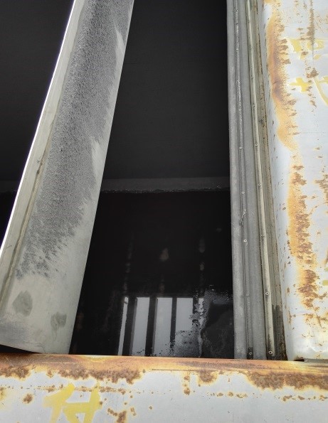 通过与工作人员的深入交流,发现转叶式风门系统存在的几个问题,一是密封问题,虽然转叶式风门的漏风量在规定的范围内,但在下雨时雨水会通过顶部水平布置的转叶式风门的叶片缝隙进入风机房,积水在风机房积聚无法排出;二是铜套处容易生锈,产生极大的阻力,使电机无法带动转叶式风门开闭,不能完成一键倒机且容易烧坏电机。工作人员希望太原理工大学能把现场应用中出现的问题在后期的研究中提出措施逐步解决。转叶式风门现有问题如图3所示。