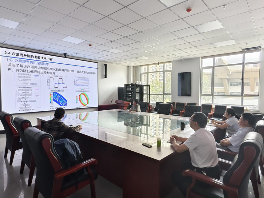 首先,王誉延博士研究生向李旭东总经理一行做了题为“矿山永磁提升机成套技术与装备”的汇报,主要从WK-12c电铲基本情况、提升机发展历程及应用情况和永磁驱动提升装置技术方案及性能研究三个方面展开汇报。