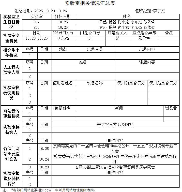 实验室相关情况汇总表(2025.10.20-10.26)